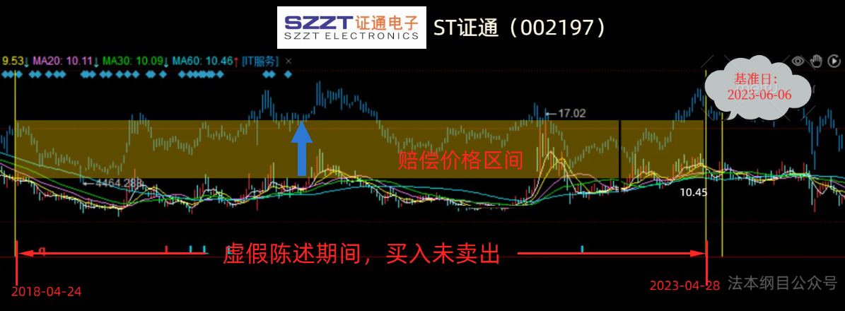 第一根黄线和第二根黄线之间为买入区间(虚假陈述影响区间),第二根和第三根黄线之间为卖出或持有区间(基准价格计算区间)。从K线图可以看出大致的亏损买入期间。