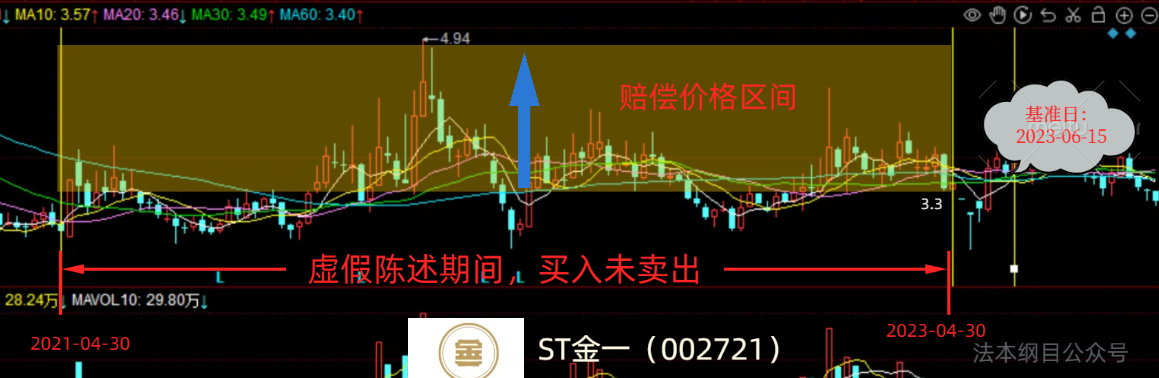 第一根黄线和第二根黄线之间为买入区间(虚假陈述影响区间),第二根和第三根黄线之间为卖出或持有区间(基准价格计算区间)。从K线图可以看出大致的亏损买入期间。