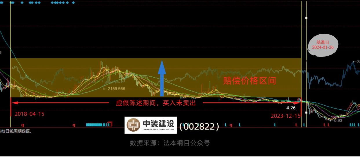第一根黄线和第二根黄线之间为买入区间(虚假陈述影响区间),第二根和第三根黄线之间为卖出或持有区间(基准价格计算区间)。从K线图可以看出大致的亏损买入期间。