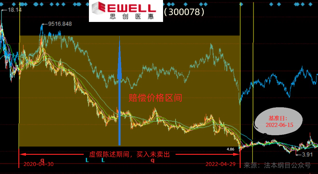 第一根黄线和第二根黄线之间为买入区间(虚假陈述影响区间),第二根和第三根黄线之间为卖出或持有区间(基准价格计算区间)。从K线图可以看出大致的亏损买入期间。