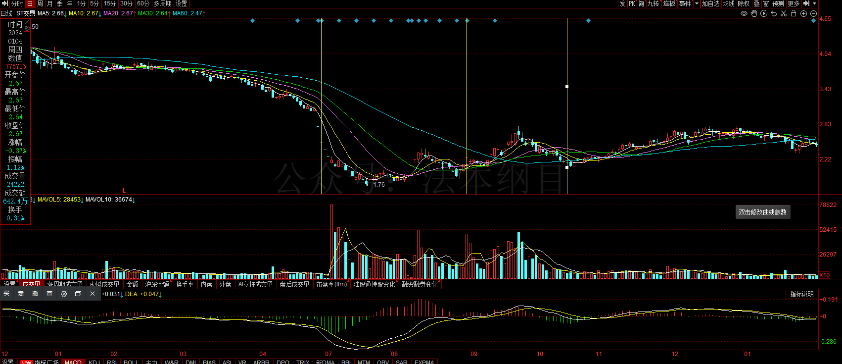 第一根黄线和第二根黄线之间为买入区间(虚假陈述影响区间),第二根和第三根黄线之间为卖出或持有区间(基准价格计算区间)。从K线图可以看出大致的亏损买入期间。