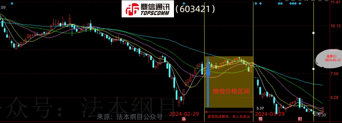 第一根黄线和第二根黄线之间为买入区间(虚假陈述影响区间),第二根和第三根黄线之间为卖出或持有区间(基准价格计算区间)。从K线图可以看出大致的亏损买入期间。